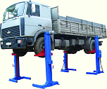 г/п. 10 тонн. Подкатной. Электромеханический. Четырёхстоечный. Для ремонта грузовых автомобилей отечественного и импортного производства и автобусов на любой ровной площадке. Подъем осуществляется за колёса, диаметр колёсных дисков 20-22 дюйма. Поставляется в 2 вариантах Стандарт (в помещение) и ТЗ (Для эксплуатации на улице).