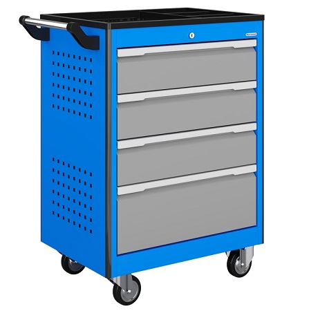 Тележка инструментальная MasterLine комплектуется 4 выдвижными ящиками. Толщина металла 0,8мм. Цельносварная конструкция корпуса тележки. Центральный замок Euro-Lock. Шариковые направляющие полного выдвижения. Алюминиевая ручка. На боковых стенках тележки выполнена перфорация для установки навесных элементов из нашего каталога.