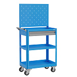 Корпус выполнен из листовой стали толщиной от 0,6 до 1,5 мм., покрыт полимерной порошковой краской. С перфорированной панелью для навесных элементов и выдвижным ящиком на шариковых телескопических направляющих. Общая равномерно-распределённая нагрузка на тележку - до 100 кг. Верхняя и средняя полка имеют высоту борта 40 мм., нижняя полка имеет высоту борта 60 мм. Размер 950х700х450 мм.