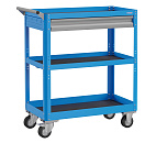 Корпус выполнен из листовой стали толщиной от 0,6 до 1,5мм., покрыт полимерной порошковой краской. С выдвижным ящиком на шариковых телескопических направляющих. Общая равномерно-распределённая нагрузка на тележку - до 100кг. Верхняя и средняя полка имеют высоту борта 40 мм., нижняя полка имеет высоту борта 60 мм. Размер 950х800х450 мм.