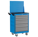 6 ящиков. Для хранения инструмента в ЕВРОЛОЖЕМЕНТАХ. Боковые панели с перфорацией (для установки аксессуаров). Цельносварная конструкция корпуса тележки. Центральный замок Euro-Lock. Шариковые направляющие полного выдвижения. Размеры (высота x ширина x глубина): 850 х 700 х 460 мм. Вес: 58,8 кг.