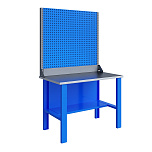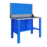 Бестумбовый. Допустимая нагрузка на столешницу 350 кг. Опорные элементы выполнены сварными из холоднокатаной стали. Для выполнения сборочных, ремонтных, слесарных, монтажных и других видов работ на производстве, в сервисных центрах, мастерских, гаражах, а также для обучения технологии в учебных заведениях. Комплектуется полкой-стенкой, расположенной под столешницей для удобного размещения габаритного инструмента и оснастки. Размеры верстака: 855x1196x696 мм. Вес: 38 кг. Поставляется в 4 комплектациях на выбор.