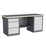 Двухтумбовый. Допустимая нагрузка на столешницу 1000 кг. Опорные элементы выполнены сварными из холоднокатаной стали. Для выполнения сборочных, ремонтных, слесарных, монтажных и других видов работ на производстве, в сервисных центрах, мастерских, гаражах, а также для обучения технологии в учебных заведениях. Комплектуется полкой-стенкой, расположенной под столешницей для удобного размещения габаритного инструмента и оснастки. Размеры верстака: 855x1596x696 мм. Вес: 128 кг. Поставляется в 4 комплектациях на выбор.