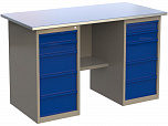 Верстак двухтумбовый поставляется в разобранном виде (4 элемента). Нагрузка на столешницу до 600 кг. Стандартный цвет: корпус - серый глянец RAL 7030, ящики и двери тумб - синий RAL 5017. Размеры:855x1400x700 мм. Масса: 107 кг.