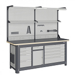Нагрузка на столешницу 1500 кг. Столешница из листа влагостойкой фанеры марки ФСФ толщиной 40 мм и листом горячекатаной стали толщиной 5 мм. Рама верстака выполнена их холоднокатаной стали. Модуль верстака выполнен сварными. Ящики в модулях устанавливаются на шариковых телескопических направляющих полного выдвижения. Квадратная перфорация для установки крючков, держателей. Размеры: 1982x1993x743 мм.