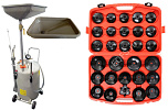 Комплект из TS-2085 маслосборник. Для быстрого слива и откачки щупами масла и антифриза из ДВС, КПП и мостов всех авто. В комплекте: Сливная чаша. Щупы гибкие 6 шт. Лоток для сливной пробки. Металлические пистолеты для откачки масла. Цифровая индикация уровня разрежения в установке. Обрезиненная ручка для транспортировки. Вмещает 90 л. = Бак 80л + сливная воронка 10л. + ES0903 Набор съемников масляных фильтров ("чашки") - 30 шт.