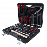 Набор инструментов в чемодане 1/4" & 1/2" 6-гранный 156 предметов. В наборе: головки 1/2", 1/4" (6РТ), головки глубокие 1/2", 1/4" (6РТ), головки TORX 1/2", 1/4", трещотка 1/2", 1/4", удлинитель 1/2", 1/4", кардан 1/2", 1/4", вороток-отвертка 1/4", держатель для бит 1/4", переходник 3/8", свечная головка 1/2" (6РТ и 12РТ), держатель для бит 5/16", вороток с шарниром 380 мм, вороток Г-образный 260 мм, биты 1/4", биты 5/16", ключи рожково-накидной: 6-24 мм, ключи разрезные, Г-образный ключ HEX, пассатижи 7", бокорезы 6", клещи с фиксатором 10", молоток 500 г, набор выколоток и зубил, отвертки с антискользящей рукояткой.