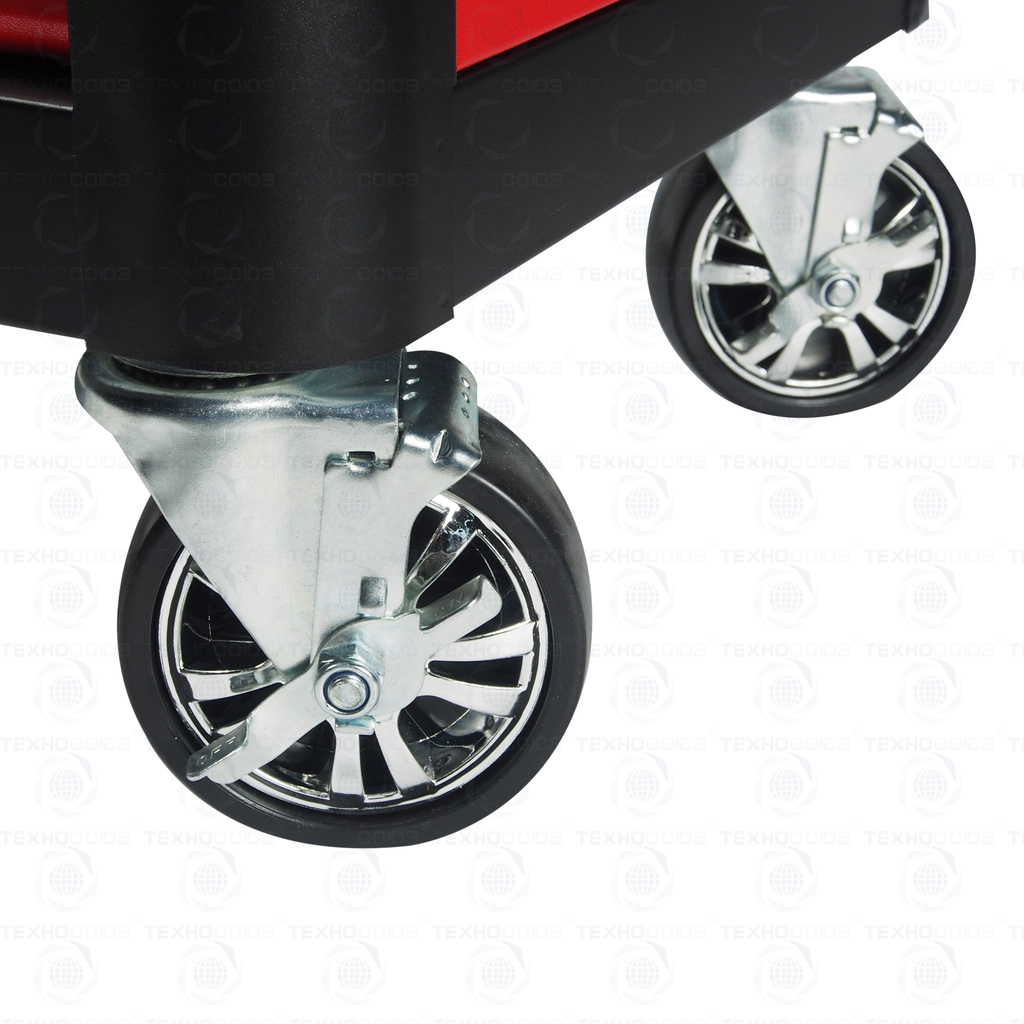 - Корпус тележки оснащен защитными бортами, что сводит к минимуму риск повреждения оборудования и нанесение травм автомеханикам во время перемещения по СТО.