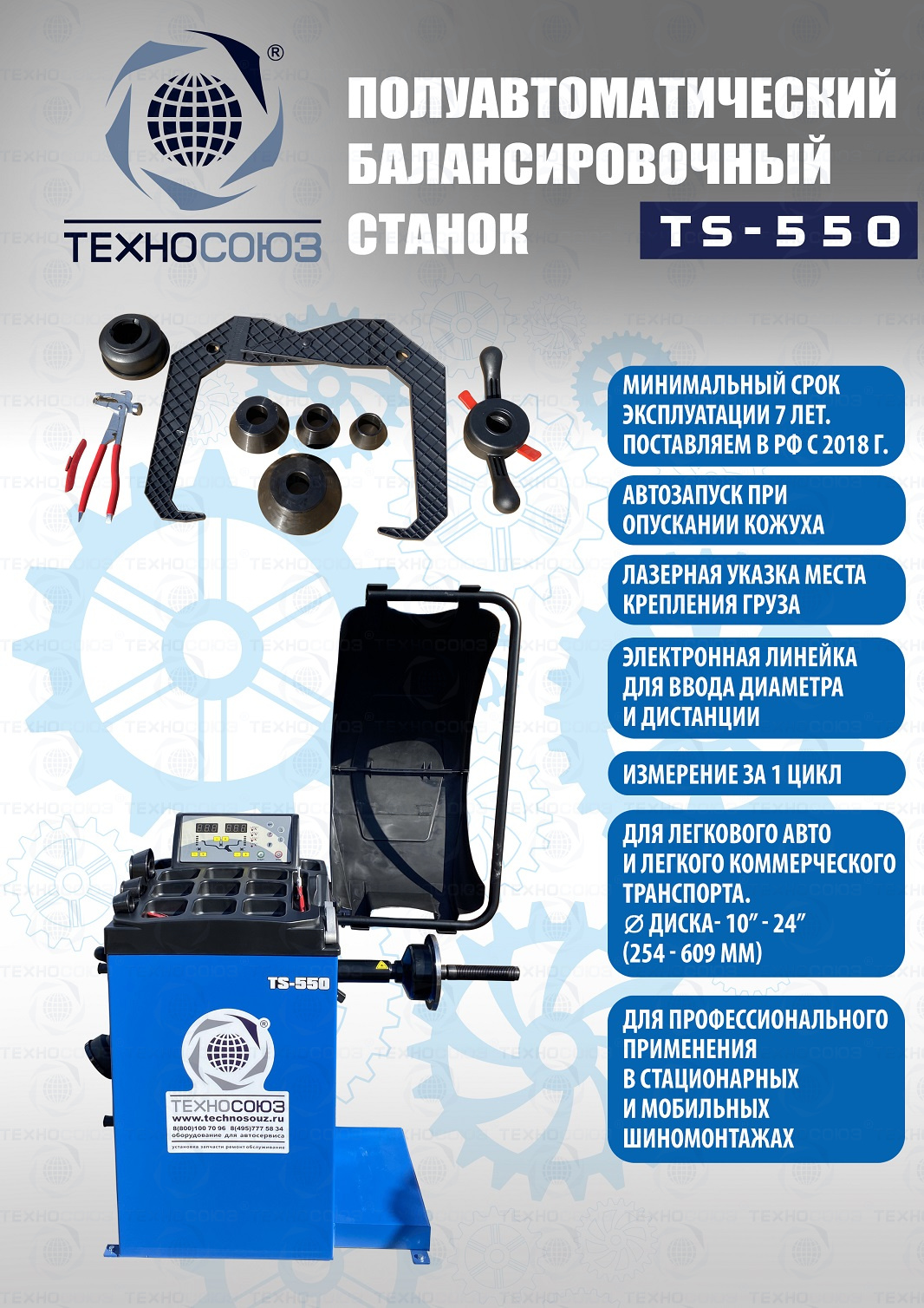 TS-550 Балансировочный станок (с лазером) с диаметром диска с резиной до 800 мм. Размеры диска: ширина 3–10” (76-254 мм) , диаметр диска 10–24” (254÷609 мм). Режимы работы DINAMIC, STATIC, ALU1, ALU2, ALU3, ALUS, ST. Автокалибровка. Гарантия 12 мес. В комплекте: кожух с автозапуском + клещи + кронциркуль + быстрозажимная гайка + набор конусов.