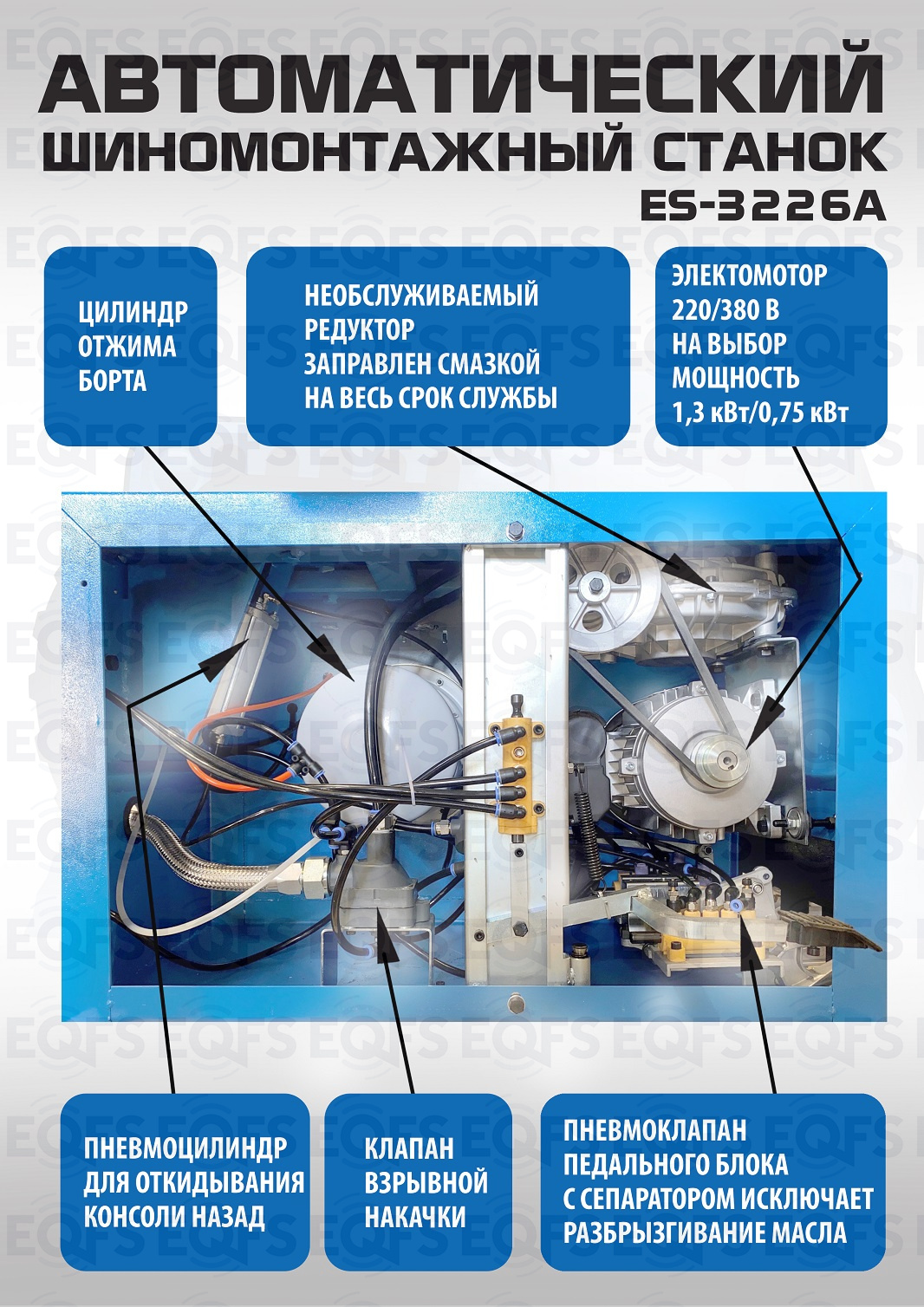 ES-3226A Надёжный шиномонтажный станок - рекомендуем. Автомат. В комплекте взрывная подкачка + «третья рука» для работы с низкопрофильными шинами и RanFlat. Все быстросъемные элементы пневмосистемы выполнены из металла, а не из пластика, что уменьшает вероятность поломки! Внешний зажим 11-21”. Внутренний зажим 12-24”. Для покрышек легковых автомобилей, внедорожников, «Спринтеров», «Газелей» и т.п.
