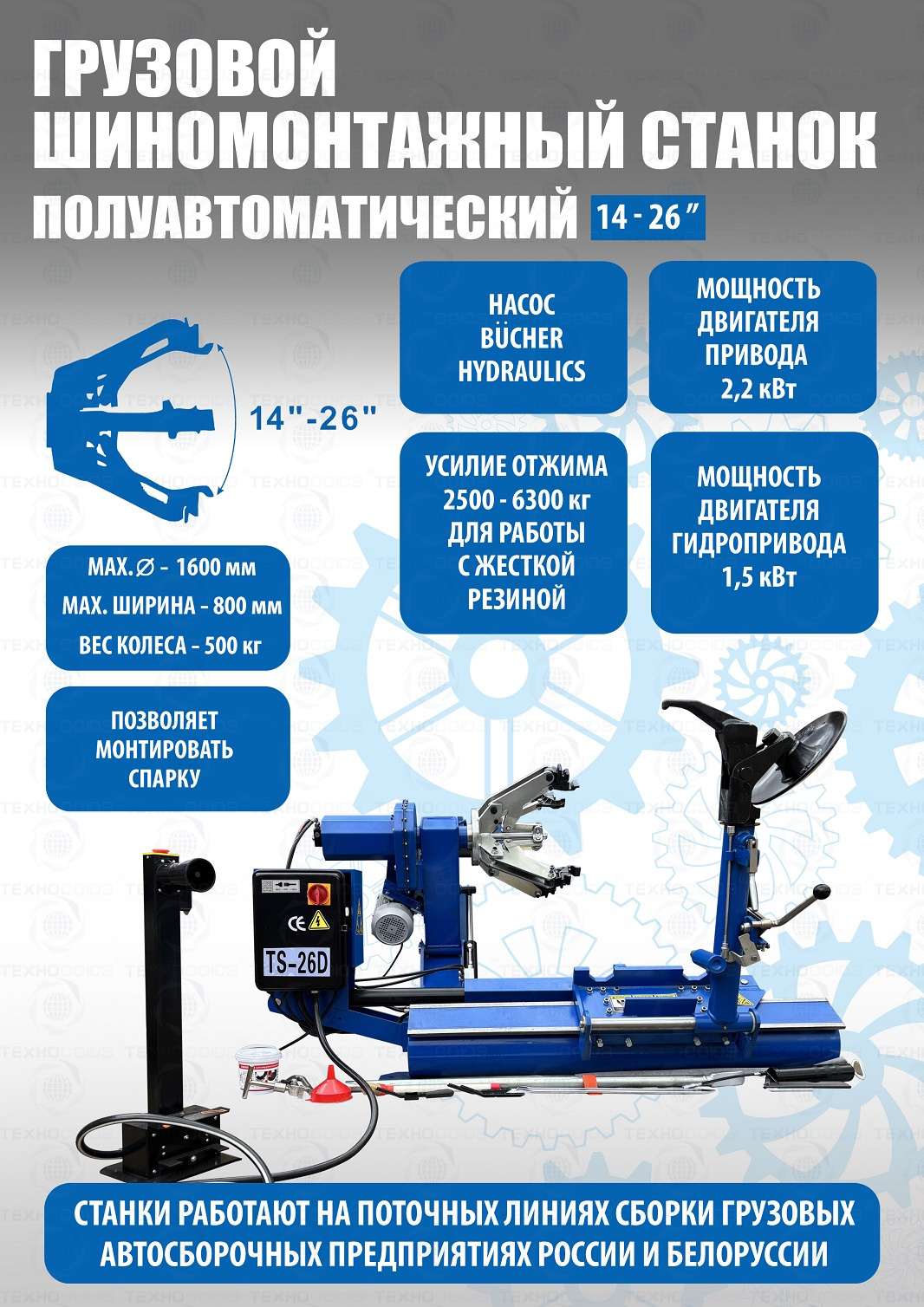 Комплект из полуавтоматического грузового шиномонтажного станка TS-26D. Отказов и рекламаций нет!!! Диски сталь, AL, с кольцами и без, 14÷26” с адаптерами 14÷42”(опция), Колесо макс. Ø1600 ширина 780мм, до 500кг. Моторы 1,5 + 2,2кВт. Гидравлика – немецкая «BUCHER HIDRAULICS». Гарантия до 18мес. + Грузовой балансировочный станок Smart Trucker подходит для балансировки колес грузовых и легковых автомобилей с диаметром диска от 9 до 28 дюймов (при ручном вводе до 30 дюймов) и шириной от 3 до 20 дюймов. Два режима работы. Настройка «нуля». Программа автоматической калибровки. Программа самодиагностики (режим ТЕСТ). В стандартную комплектацию входит подкатная тележка с ручным подъемником.