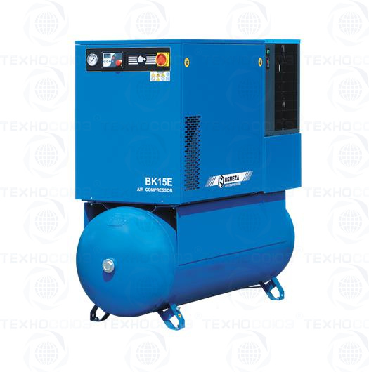Remeza ВК15E-10-500Д представляет собой винтовой компрессорный блок, соединенный с промышленным электродвигателем через клиноременную передачу. Движущиеся части устройства помещены в корпус, выполняющий защитные функции и частично поглощающий воздушные шумы от работы агрегатов.