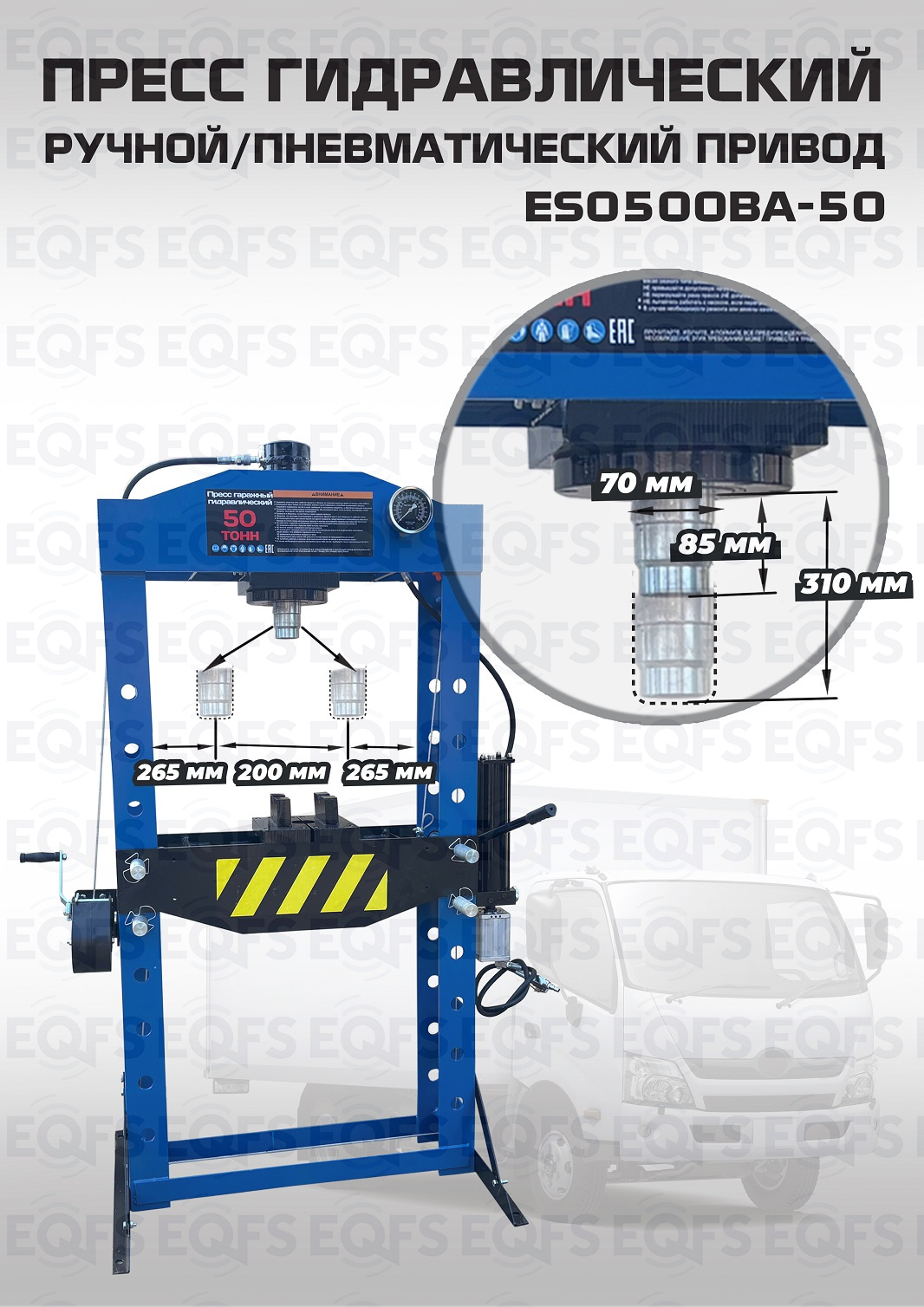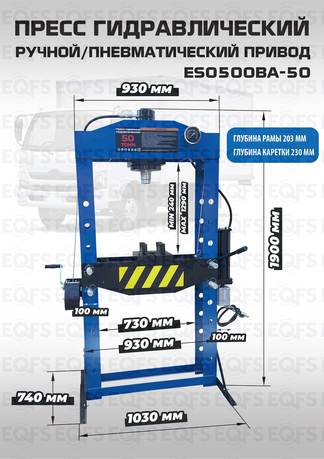 Пресс пневмогидравлический 50 тонн, 264кг. металла, полностью сварная рама, управление ручное/пневматическое. Гидроцилиндр с пуансоном перемещается по ширине каретки, клапан защиты от перегрузки, манометр, ручная лебедка. Ход поршня 220 мм. Рабочее окно 730х1290 мм. Рекомендуется для выпрессовки подшипников, деталей машин, втулок и т.п. в автосервисе, гараже и СТО. Цвет синий. Доставка РФ, РБ, Армения, Казахстан, Киргизия.