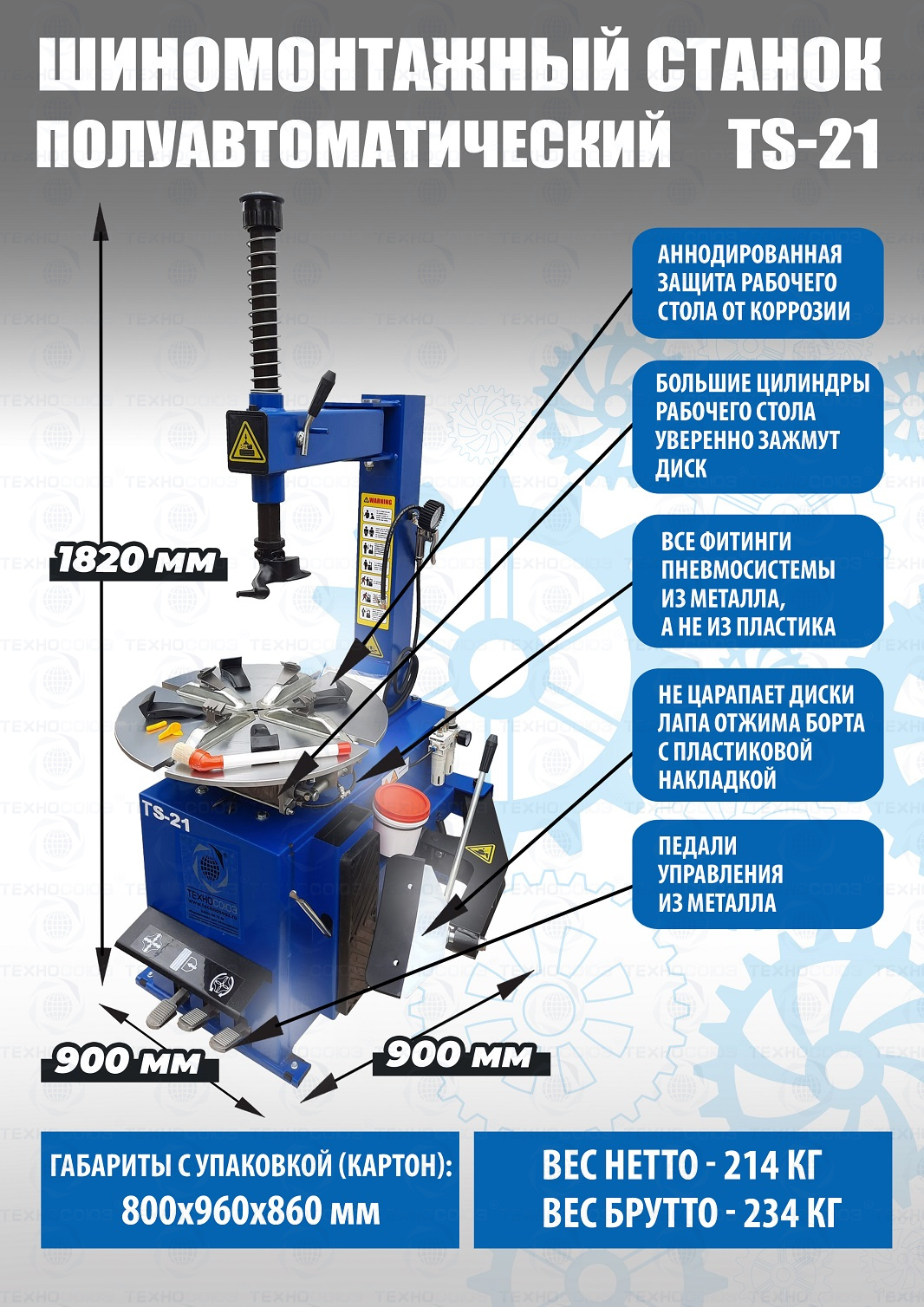 полуавтоматического шиномонтажного стенда TS-21, для колёс 99% автопарка России. От Матиза до Land Cruiser 200, Спринтеров, Газелей и пр. Для дисков: внешний 11÷18”, внутренний 12÷20”. Большой круглый стол Ø 560мм. В комплекте: пистолет для подкачки шин + монтажка + пластиковые накладки на зажимные кулачки + регулятор давления с влагоотделителем и манометром. Может комплектоваться «третьей рукой» для работы с низким профилем (опция). Очень надёжный шиномонтажный станок, рекомендуем. Напряжение шиномонтажных станков 220В или 380В на выбор.