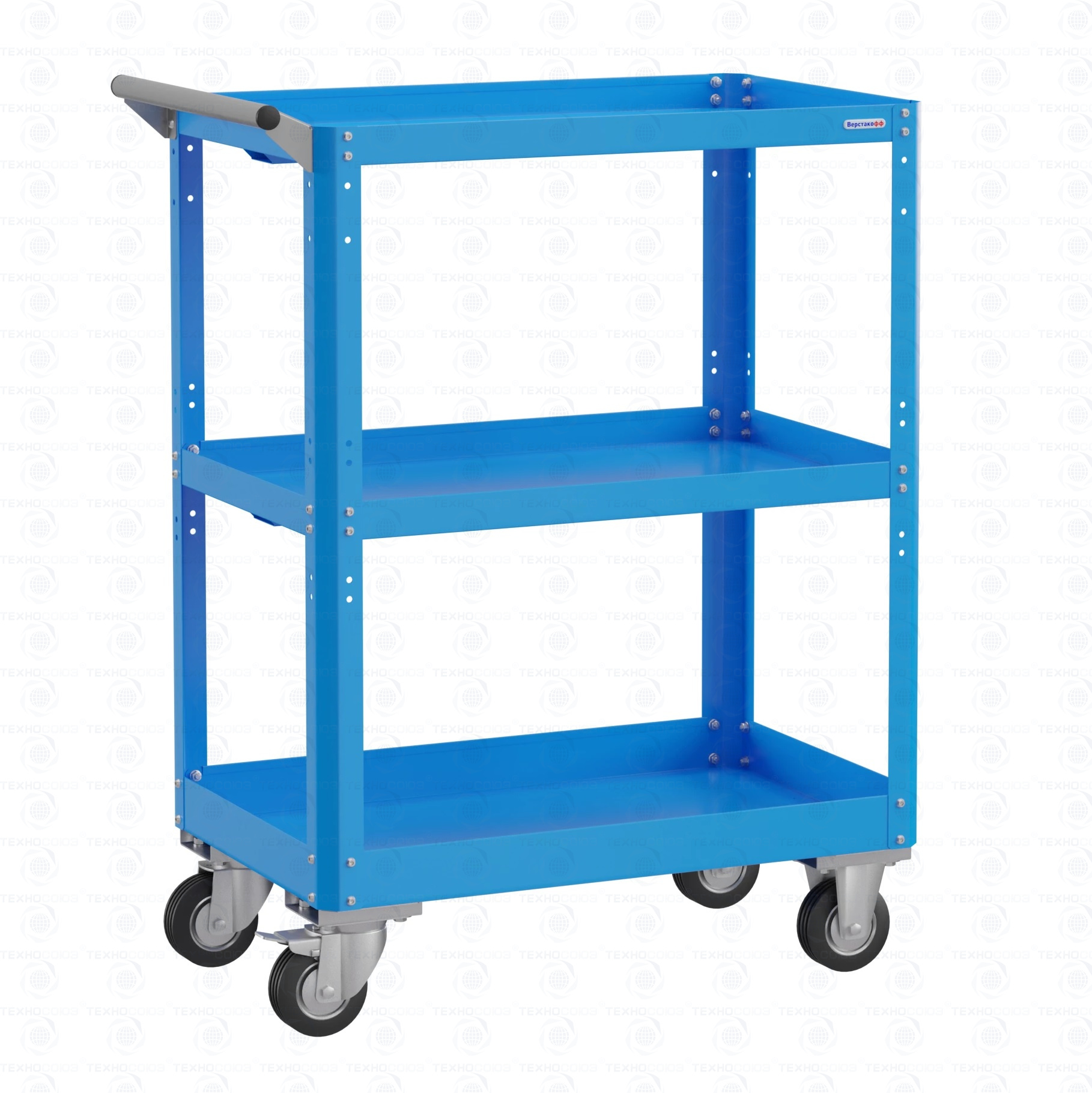 Корпус выполнен из листовой стали толщиной от 0,6 до 1,5 мм., покрыт полимерной порошковой краской. Общая равномерно-распределённая нагрузка на тележку - до 100кг. Верхняя и средняя полка имеют высоту борта 40 мм., нижняя полка имеет высоту борта 60 мм. Размер 950х700х450 мм.