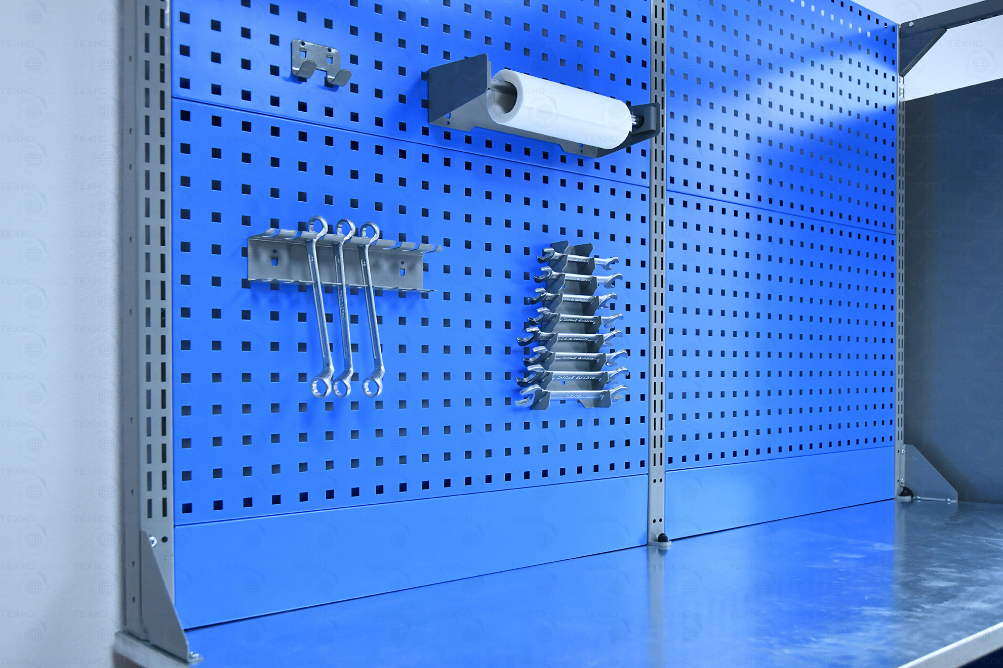 Двойной экран (перфорированные панели) верстака выполнен с квадратной перфорацией 12х12 мм с шагом 38 мм для установки крючков, держателей и других аксессуаров. Экран крепится к столешнице с помощью специальных кронштейнов. Максимальная масса груза, равномерно распределенного по поверхности экрана, составляет 21 кг.