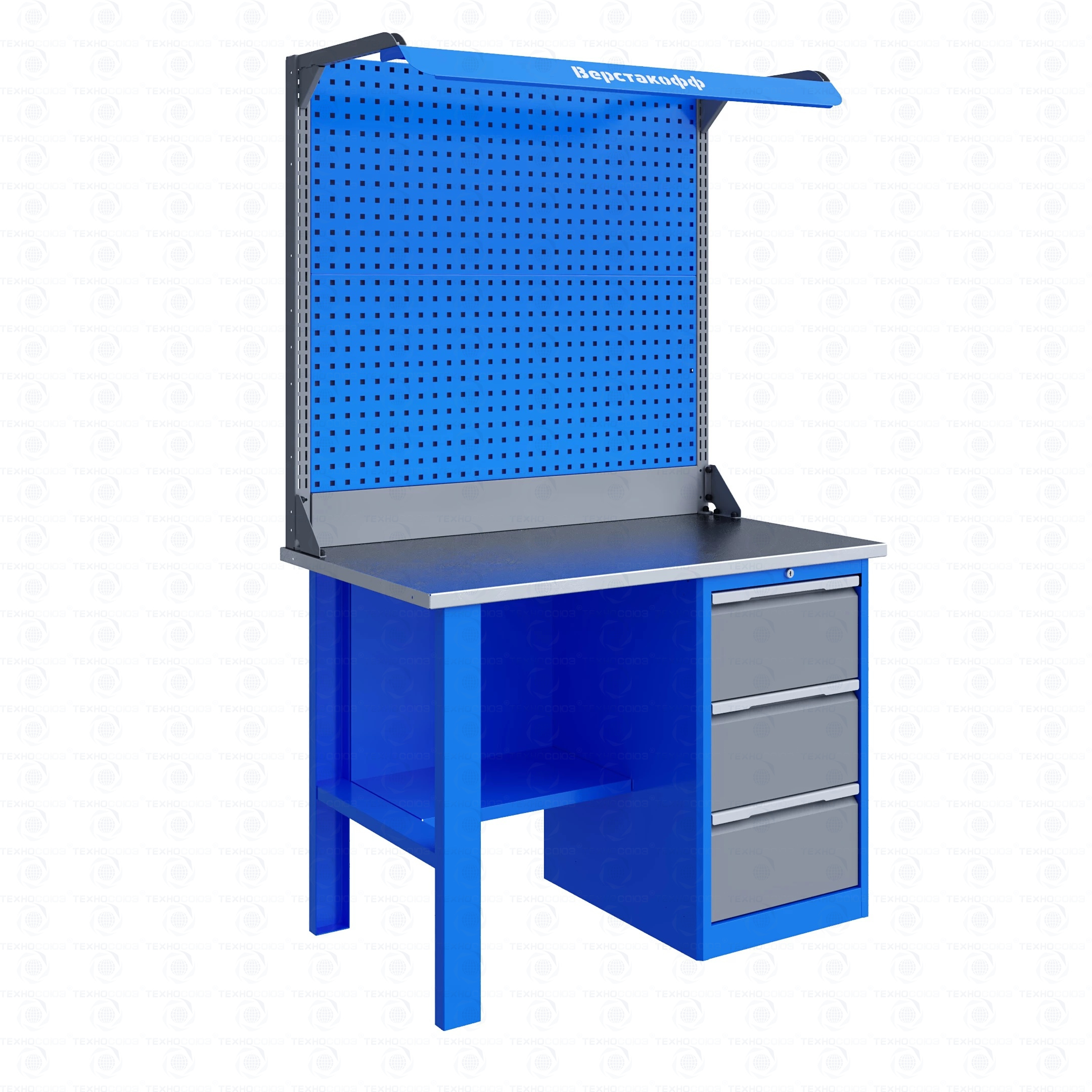 Верстак комплектуется полкой-стенкой, расположенной под столешницей для удобного размещения габаритного инструмента и оснастки.