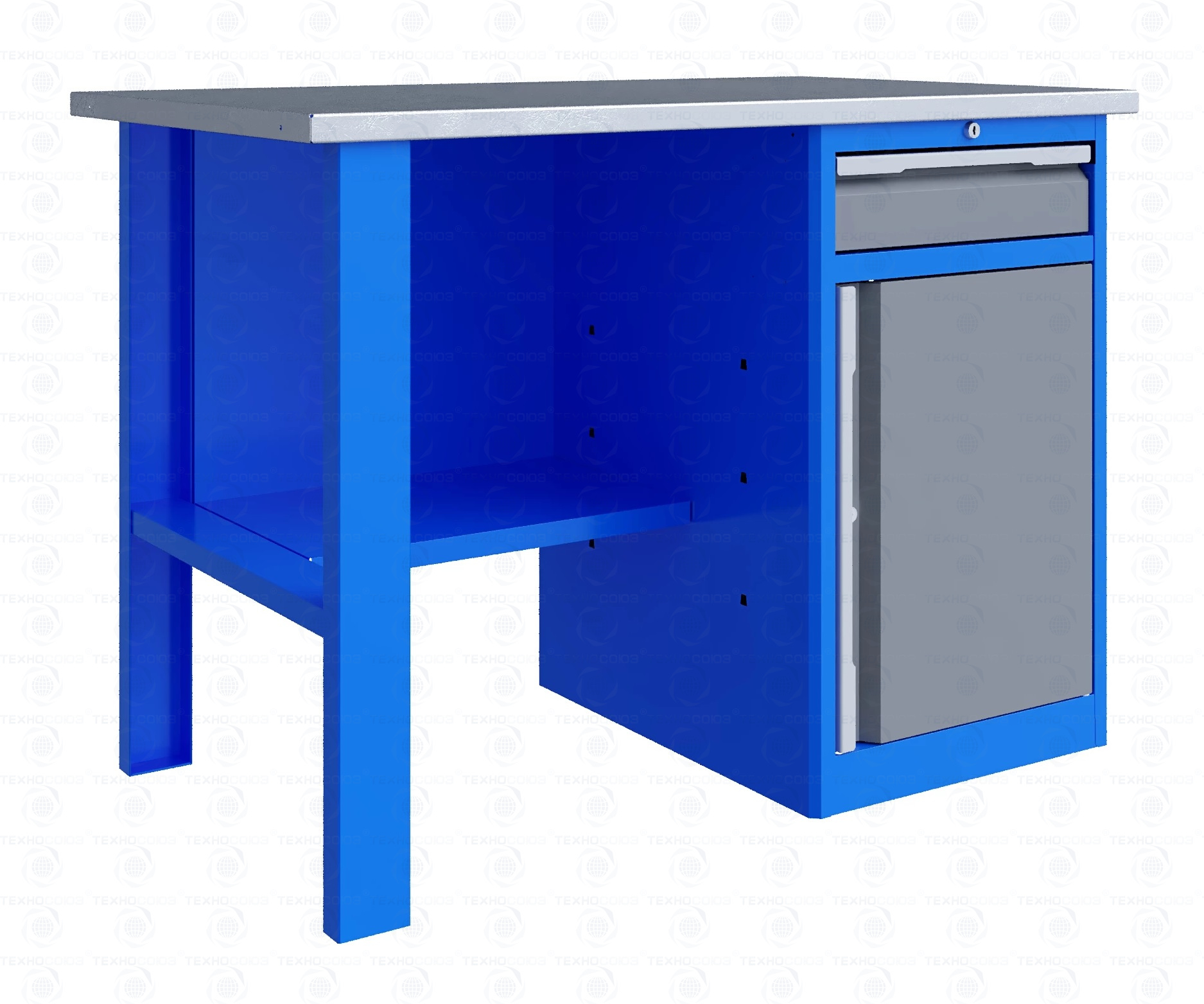 Тумба верстака - сварная. Ящики в тумбе устанавливаются на шариковых телескопических направляющих полного выдвижения. В тумбе P8 установлен малый ящик и имеется отделение с дверью и одной полкой. Внутренние размеры малых ящиков (ВхШхГ), не более: 103 х 397 х 520 мм. Ящик снабжен центральным замком с поворотом ригеля 180 градусов и подпружиненной тягой. В комплекте два ключа. Полка устанавливается на парах специальных формованных зацепов, выполненных в боковых стенках тумбы. Имеется возможность смены стороны открывания двери. Дверь тумбы снабжена центральным замком с поворотом ригеля 180 градусов. В комплекте имеется два ключа.